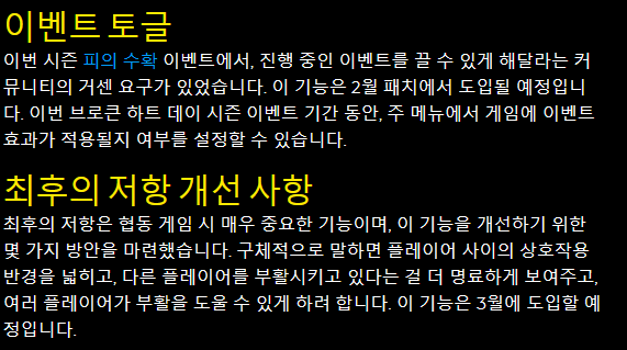 그 이외에도 성능 최적화와 밸런스 패치에 대한 언급이 있긴한데 이 부분들은 실제 결과가 어떻게 나오냐에 따라 평가가 갈릴 것 같습니다. 게임 자체는 준수한 명작이라고 생각하지만 나쁜 최적화와 불편한 편의성, 멀티플레이 관리의 소홀등의 문제가 컸었는데 이번에 많이 개선 좀 했으면 좋겠습니다 제발