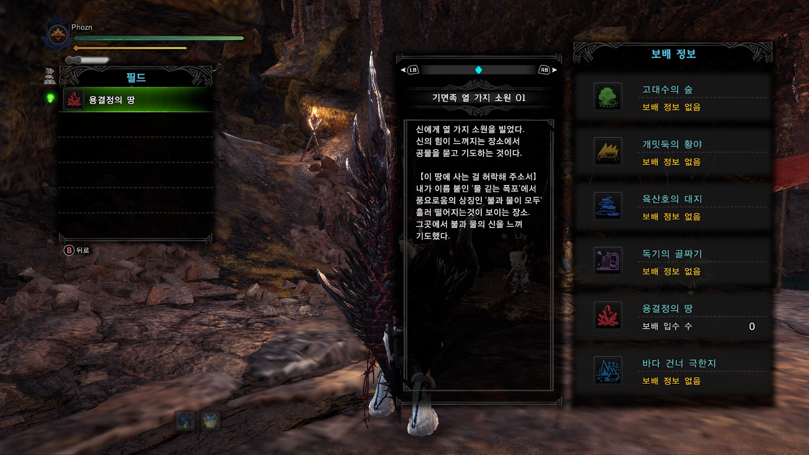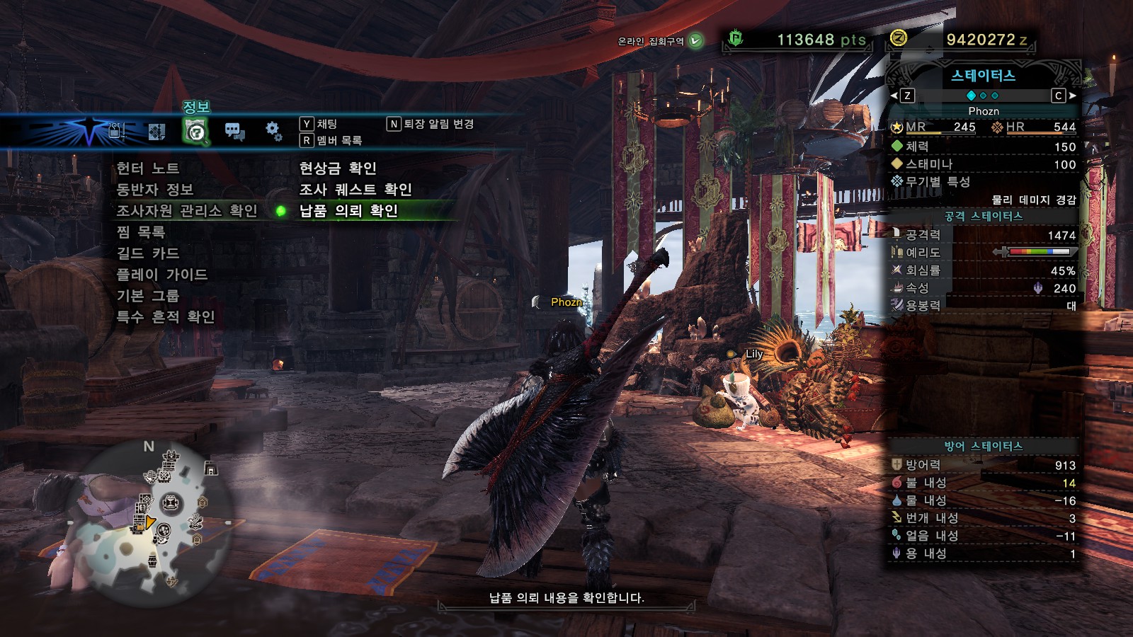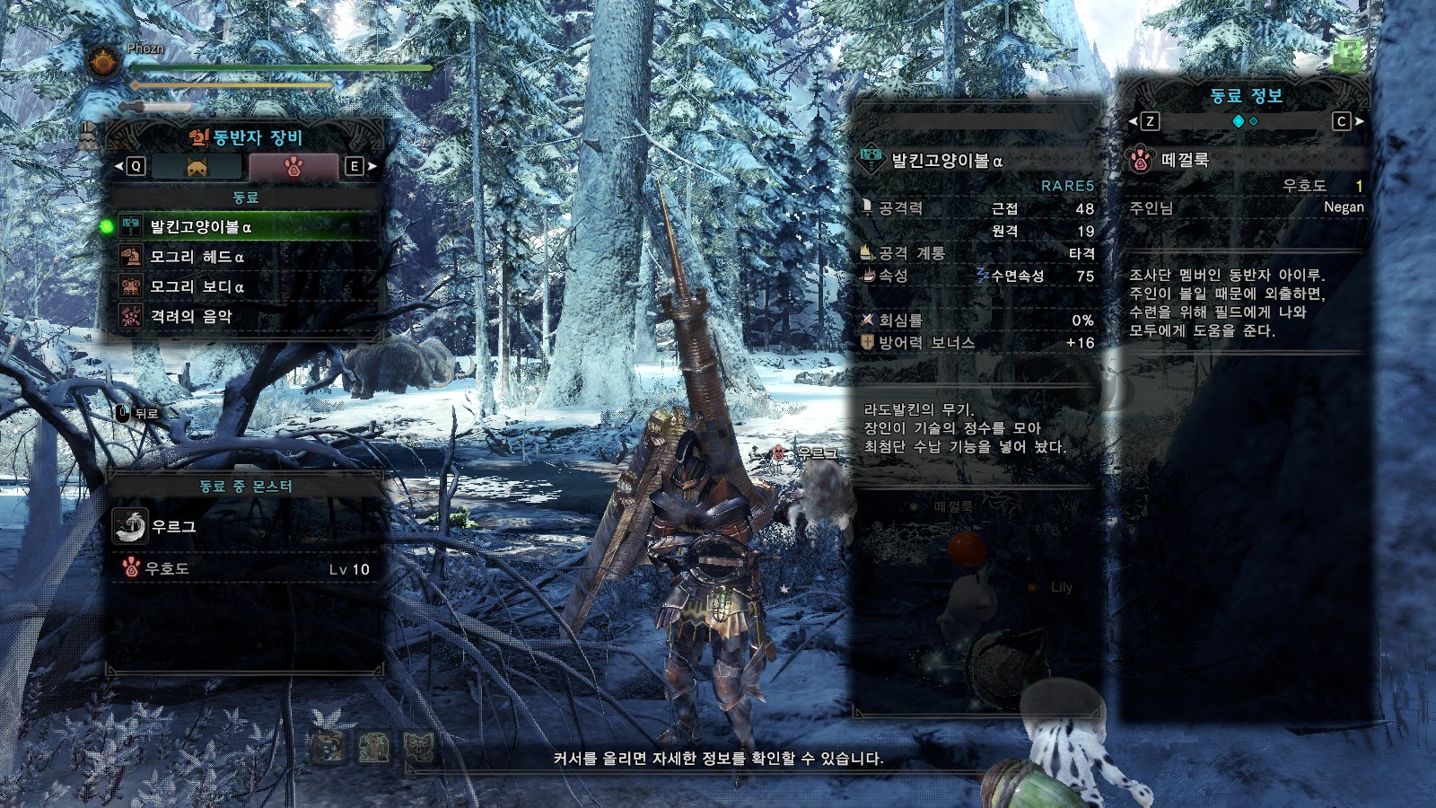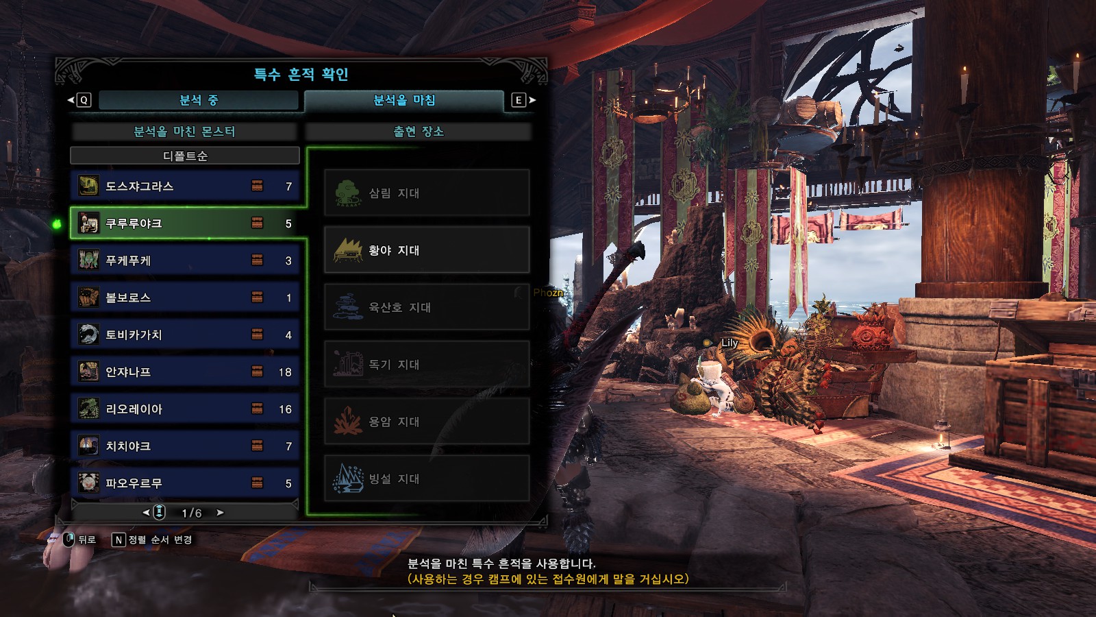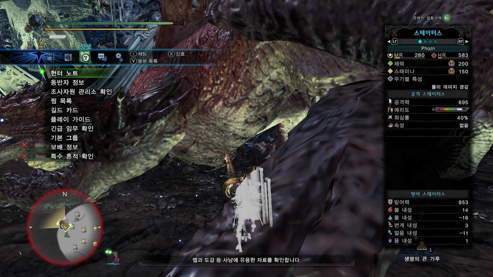 몬스터헌터의 메뉴를 열어보시면 정보 탭에 동반자 정보, 찜 목록, 조사자원 관리소 확인, 특수 흔적 확인, (긴급 임무 조사 확인) 등이 있습니다.
