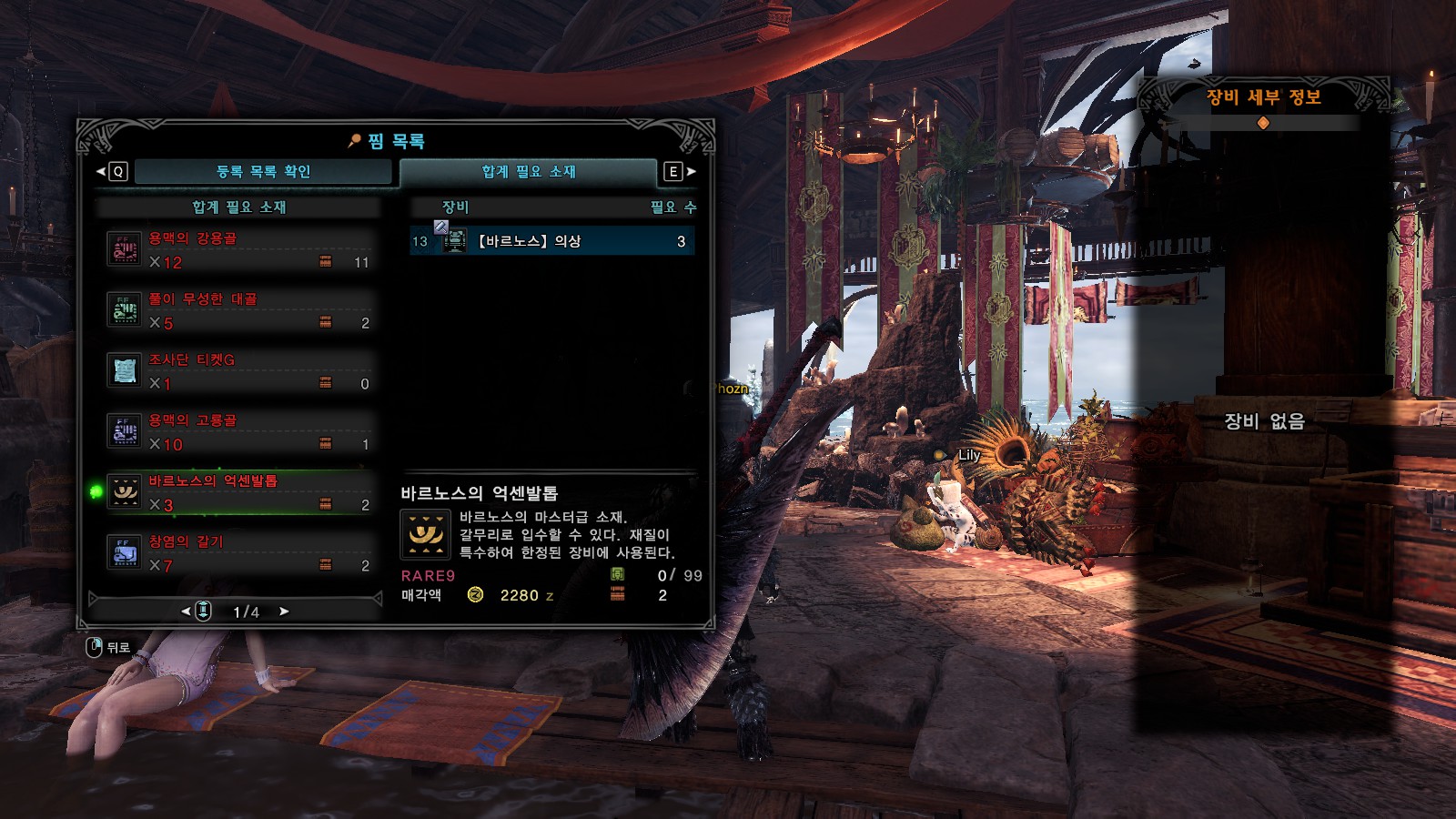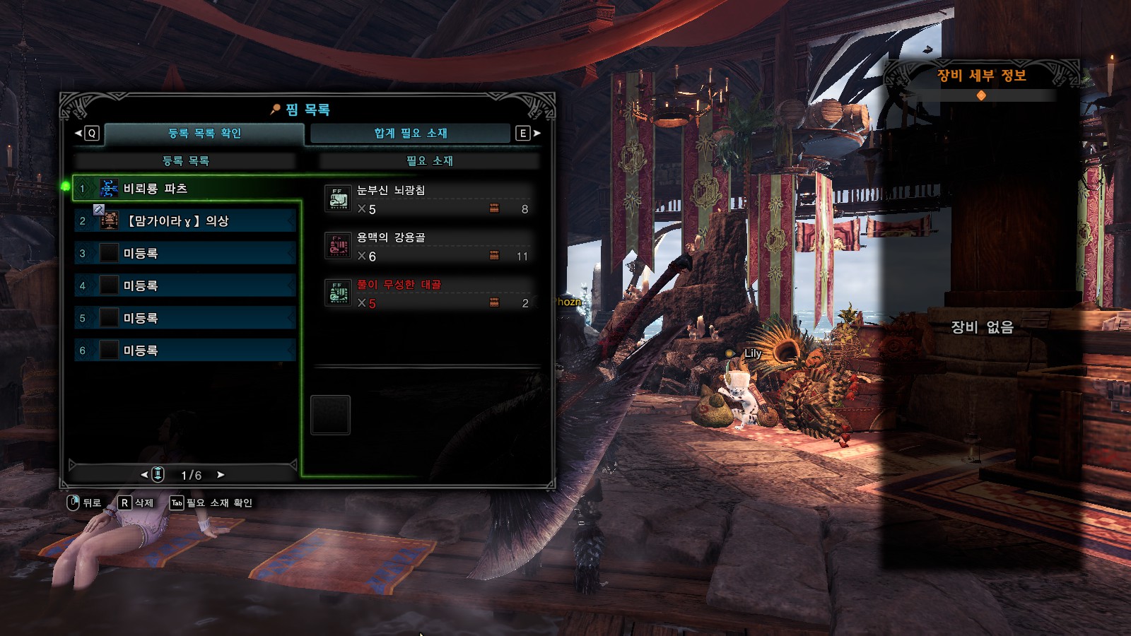 찜 목록은 자신이 필요로 하는 소재들을 확인할 수 있는 메뉴로 공방에서 만들고 싶은 장비들을 등록 시 표기해줍니다.
