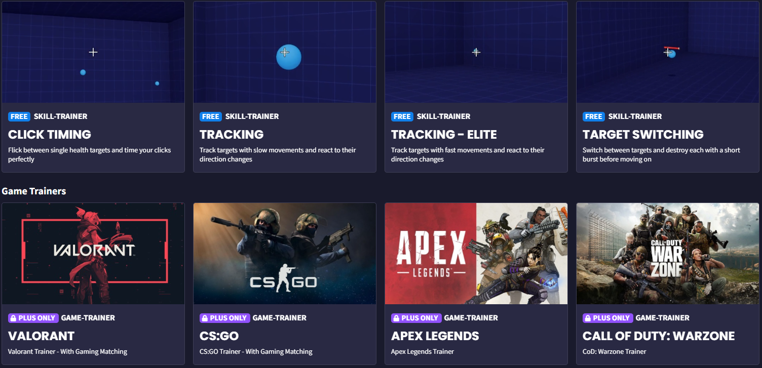 기본 유저는 다양한 에임 훈련들의 기본형을 사용가능하며 Plus+ 유저로 결제하면 유명 게임들의 전용 훈련과 코칭 등을 받을 수 있는듯 합니다.