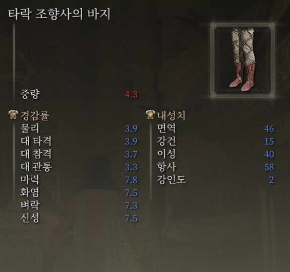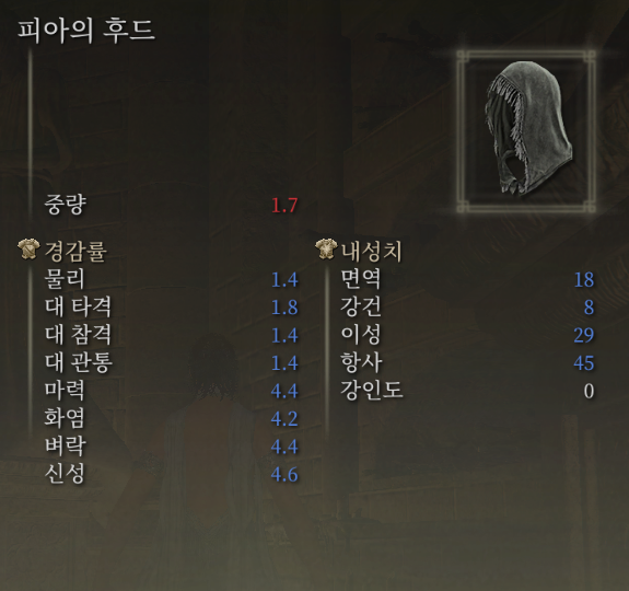 혹여 주력장비로 피아 세트가 없거나 싫다면 루사트 같이 마법사 계열의 의류들이 대개 준수한 항사 내성 수치를 가지고 있으며, 경감률을 신경 쓰신다면 그냥 '대변 먹는 자' 세트를 통째로 끼시는 것도 괜찮습니다.
