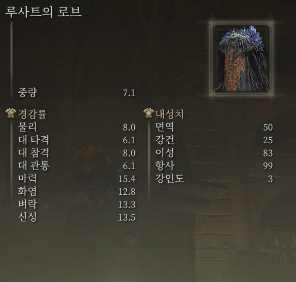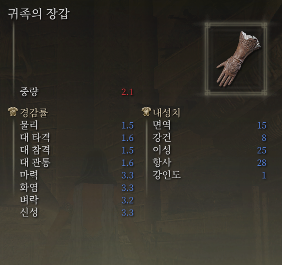 엘든링의 갑옷들은 단순하게 이분하자면 물리 및 속성 공격에 대한 내성이 뛰어난 갑옷 계열과 상태 이상에 대한 내성치가 높은 천옷 계열이 있습니다.