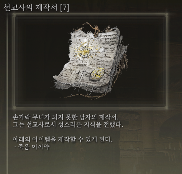 죽음 이끼약은 '선교사의 제작서 [7]'를 획득 시 제작 가능하며, 밤 이슬의 헬바 (시프라 강 우물, 녹스텔라 등 지하 구역), 동굴이끼 결정 (다양한 미니던전들), 황금지네 (교회 나 지하 지역 몇몇 등 리스폰은 안되는 듯 함) 들을 조합해야 합니다.