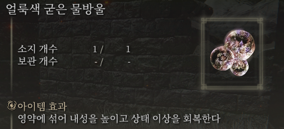 여기에 영약 중에 상태 이상을 회복하고 내성치를 올려주는 물방울인 얼룩색 굳은 물방울을 영약에 추가한 뒤