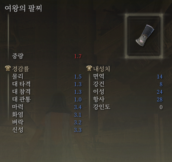엘든링의 갑옷들은 단순하게 이분하자면 물리 및 속성 공격에 대한 내성이 뛰어난 갑옷 계열과 상태 이상에 대한 내성치가 높은 천옷 계열이 있습니다.