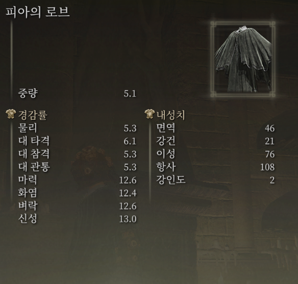 혹여 주력장비로 피아 세트가 없거나 싫다면 루사트 같이 마법사 계열의 의류들이 대개 준수한 항사 내성 수치를 가지고 있으며, 경감률을 신경 쓰신다면 그냥 '대변 먹는 자' 세트를 통째로 끼시는 것도 괜찮습니다.
