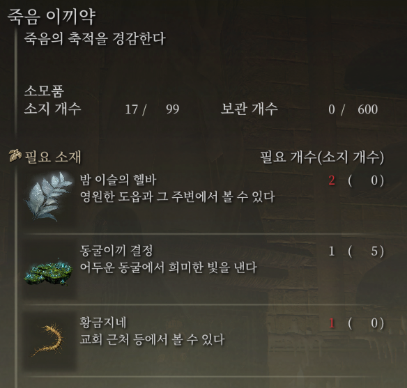 죽음 이끼약은 '선교사의 제작서 [7]'를 획득 시 제작 가능하며, 밤 이슬의 헬바 (시프라 강 우물, 녹스텔라 등 지하 구역), 동굴이끼 결정 (다양한 미니던전들), 황금지네 (교회 나 지하 지역 몇몇 등 리스폰은 안되는 듯 함) 들을 조합해야 합니다.