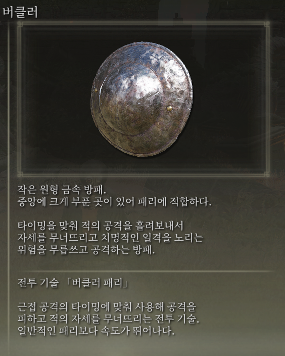 엘든링 내에서 가장 빠르고 긴 지속시간의 패리를 가진 방패로 주로 공격패턴이 명확히 보이는 기사형 몹들이나 멀기트, 말레니아, 라다곤 등 연속 압박이 잦아 딜 타임을 잡기 까다로운 인간형 보스들을 공략할 때 쓰이며, PVP에서 패리를 노린다면 가장 현실성 있는 수단입니다.