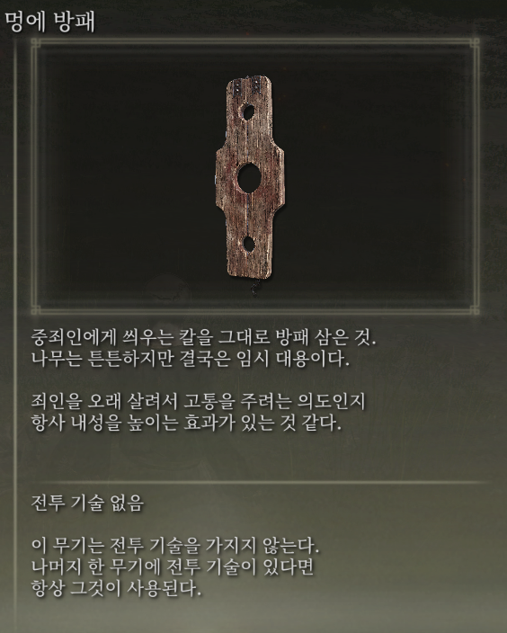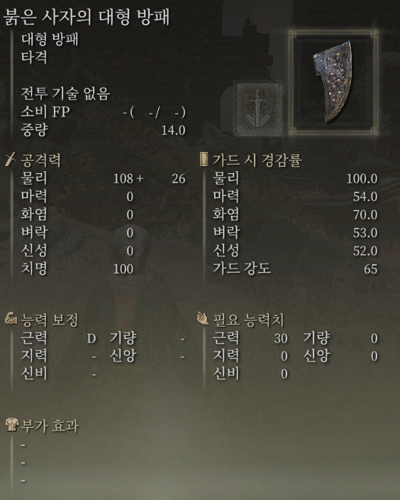 대형 방패들 중 근력이 낮을 때 가성비로 쓰기 좋은 대형 방패입니다.
