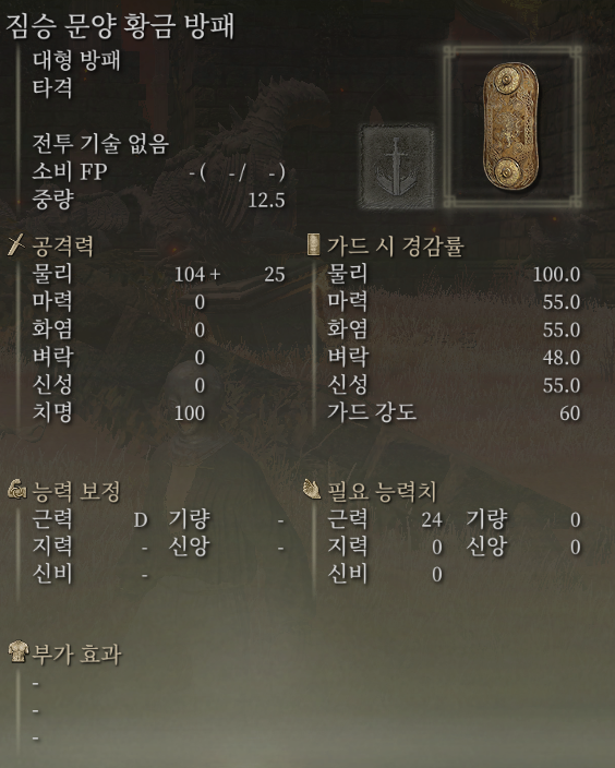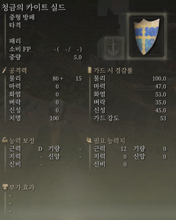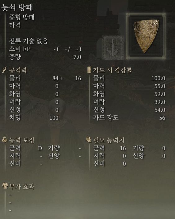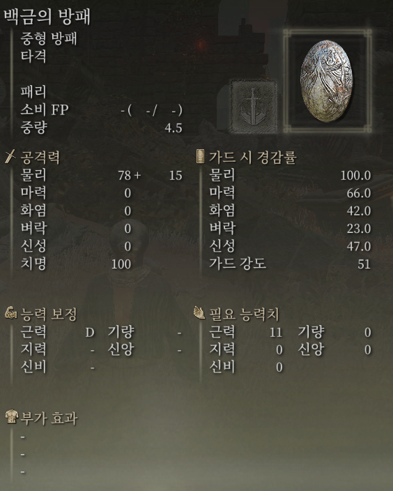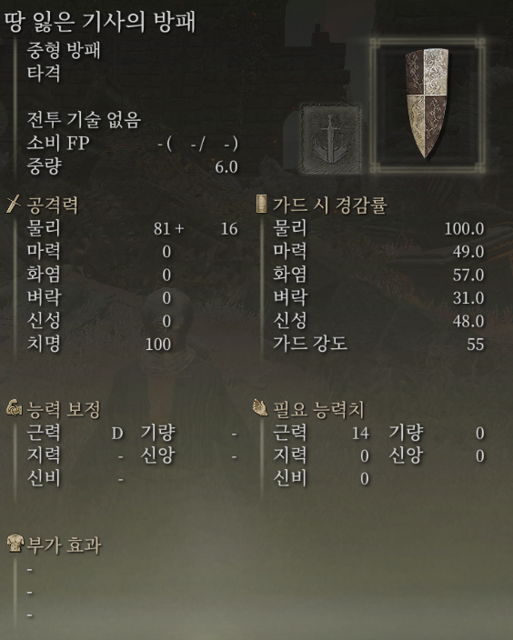 습득 편의성이나 내성컷은 놋쇠 방패가 조금 더 높지만 PVP 캐릭을 만들거나 능력치 효율, 무게 효율 등을 고려한다면 땅 잃은 기사의 방패가 더 좋을 수도 있겠습니다.
