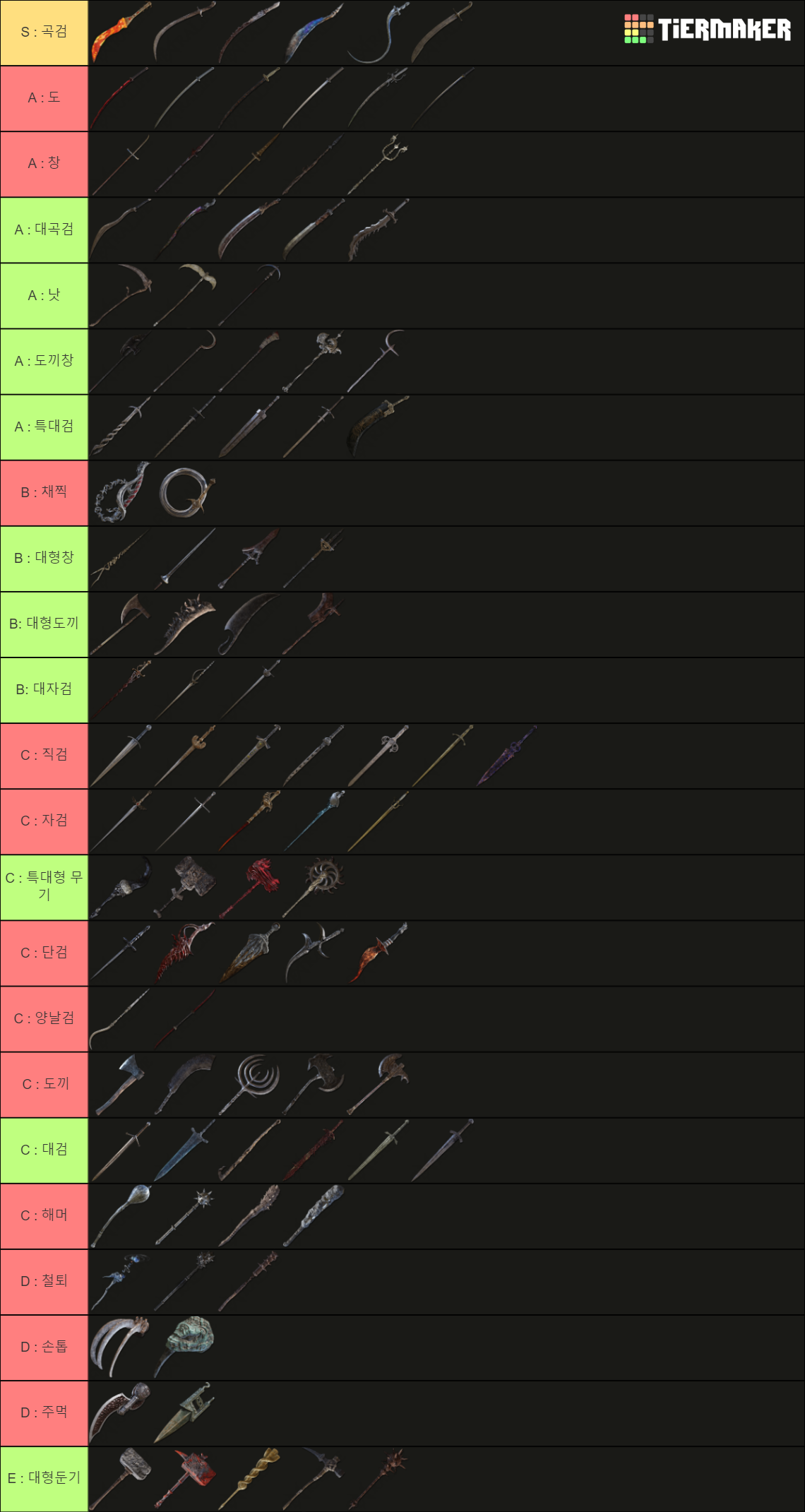 티어메이커 사이트에 엘든링 모든 무기 티어만들기가 있길래 심심풀이로 만들어 봤습니다.