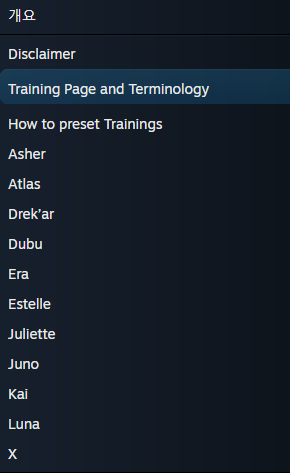 스팀 오메가 스트라이커즈 커뮤니티 허브의 가이드 부문에 'Omega Strikers Character Trainings' 라는 가이드 글이 있습니다.